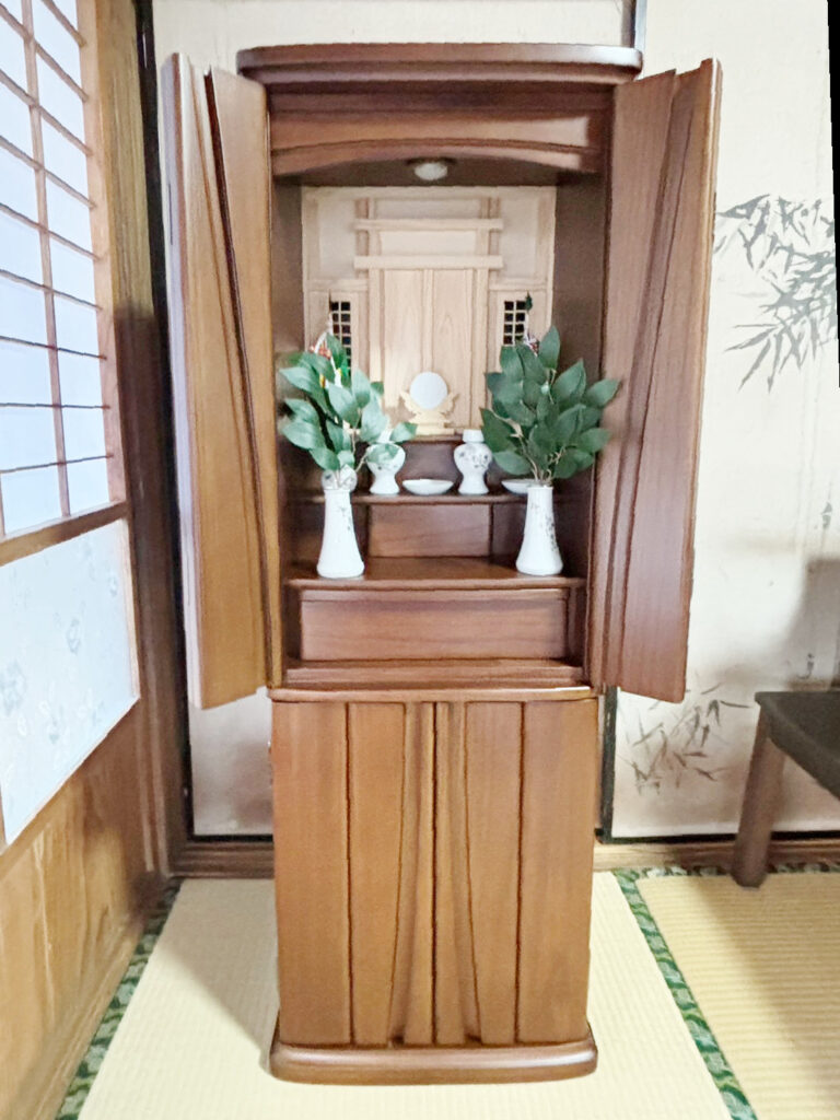 鹿屋店へご縁をいただきまして、まことにありがとうございます。お近くにお住いの息子さんご夫婦と見に来てくださいました。T様が「これからお世話しやすいものを」とイメージされ、家具調神道壇を選ばれました。仏間のリフォームもお考えとのこと。喜んでいらっしゃいました。