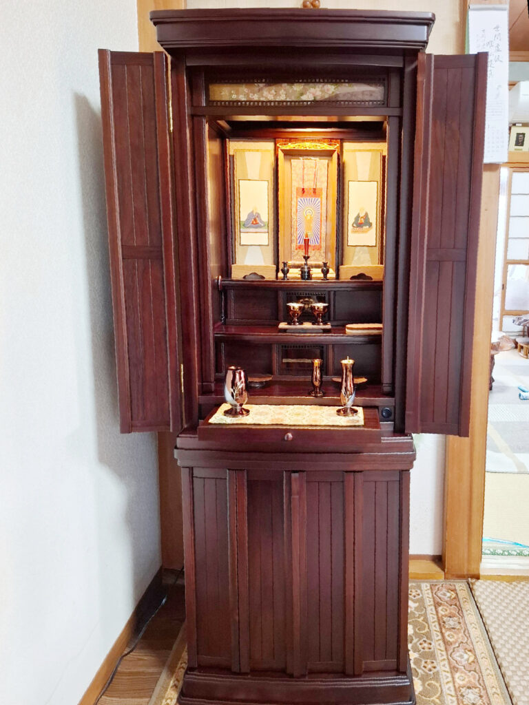 お寺様からの帰りにみな様でお立ち寄りくださいました。「仏間ではなく身近に置きたい」と家具調仏具を選ばれました。「自分が座る場所から見えて見守られているようだ」と喜んでいらっしゃいました。この度のご縁、まことにありがとうございます。