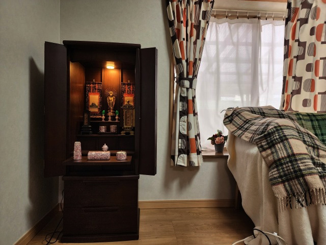 金仏壇から現代風の家具調仏壇に買い替えられました。お仏像と掛軸は今までのものを引き継がれました。「サイズが、ちょうど良い」とおっしゃいました。デザインや色も気に入っていただけました。