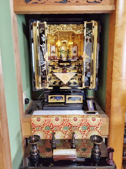 ご主人を亡くされたH様。お仏壇を見に来店されました。はじめは小型のお仏壇をお考えでした。仏間をお持ちでしたので見せていただきました。お仏間に合う金仏壇をおすすめすると、気に入っていただけご契約となりました。サイズがピッタリでした。障子の蒔絵も気に入られ、とても喜んでいらっしゃいました。今回はご縁をいただき、誠にありがとうございました。