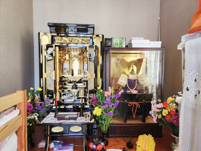 ご主人様のご逝去、謹んでお悔やみ申し上げます。今までより一回り大きい金仏壇に買い替えられました。お供えが、しやすくなったことと思います。金箔が剥げないGL加工を施してあります。長く使っていただけると確信しております。この度は誠にありがとうございました。