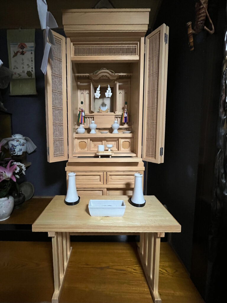 「神道壇を買いたい」と来店されました。床の間に置かれるとのことでしたので、高さのあるものをおすすめさせていただきました。お祭りのときに使う八足台も購入されました。準備万端化と思います。ご先祖様もたいへん喜ばれていることでしょう。ご満足いただけ良かったです。ご縁をいただき、ありがとうございます。