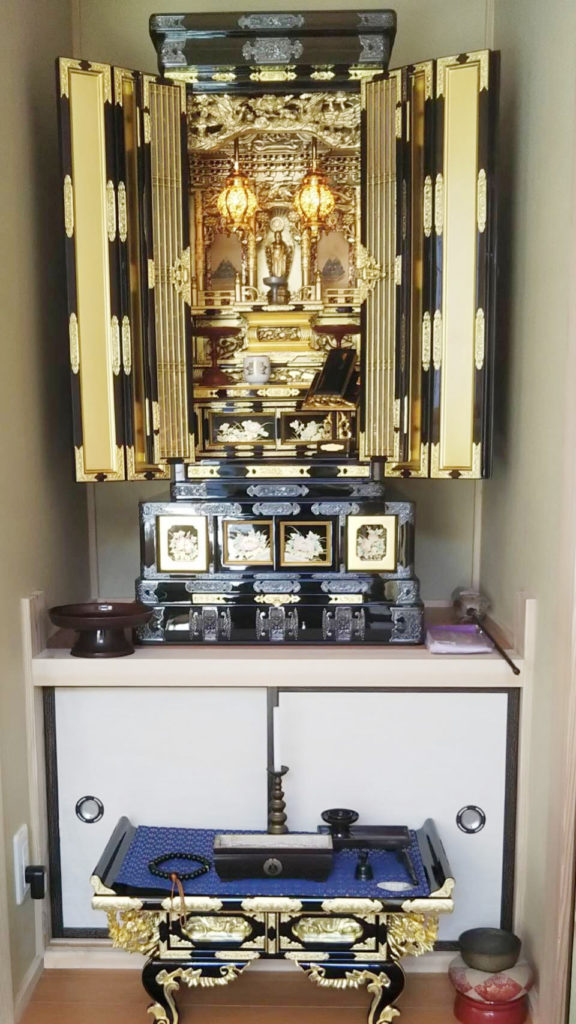 今回、お世話になりましたK様。偶然ですが挨拶訪問をしたところ前職時の仕事仲間であった事に気づき昔話に花が咲きました。お仏壇の年数が経ってきてるので修復をしたいとの事で今回お手伝いをさせていただきました。建て替えられたばかりのお宅に修復をして新品同様になったお仏壇を納めさせていただきました。大変よろこんで頂きました。人との繋がり、再会に感謝です。