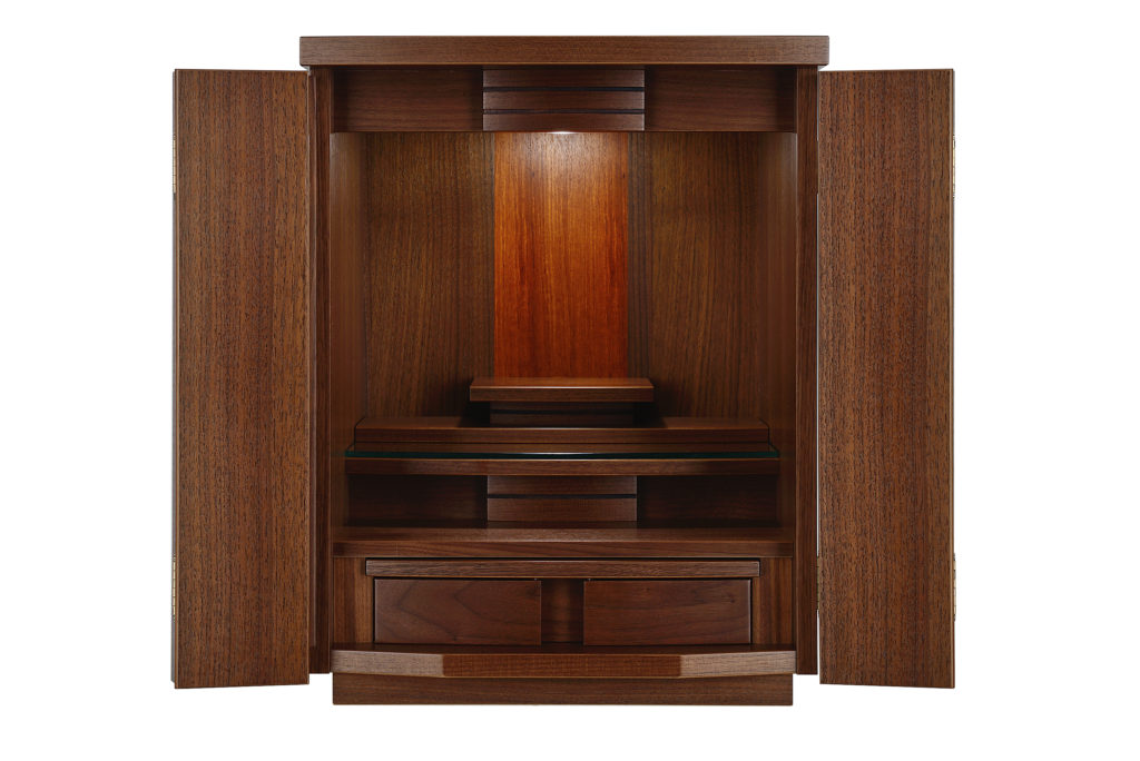 亡くなられたご主人がシンプルな仏壇を希望されていたとの事で、奥様は小型仏壇の家具調タイプを選んで決めて頂けました。TV横のスペースに「いつも見えるところ」にと設置させていただきました。