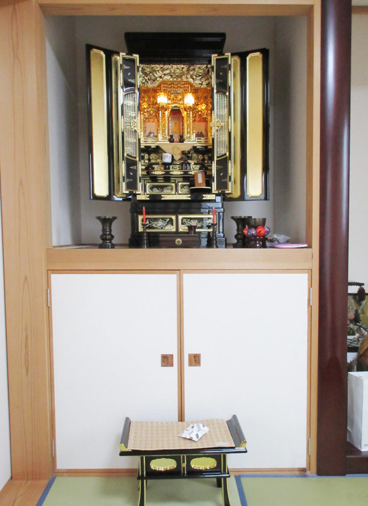 この度は「佛壇の古屋鋪」にご縁をいただきまして、誠にありがとうございました。初めてお仏壇をご購入されるM様。ご自分でお仏間の寸法を測ってきてくださいましたので、お仏間に合うサイズのお仏壇をすぐにご紹介する事ができ助かりました。立派なお仏間にお仏壇が入りました。「ホッとした」とのお言葉を聞き私共も安心しました。これからも末永いお付き合い、よろしくお願いいたします。又、なにかありましたら、いつでもお声かけください。