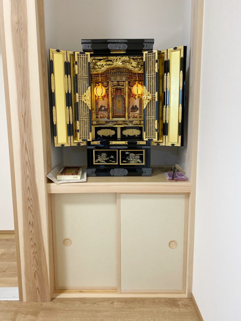 今回はご縁をいただき、ありがとうございました。とても楽しみにされていました。仕上がったお仏壇を、工場からお店に届いた時点で嬉しそうに写真を撮られるお姿が印象的でした。新築のお宅の引き渡しの当日に、何よりもまずお仏壇を入れさせていただきました。
