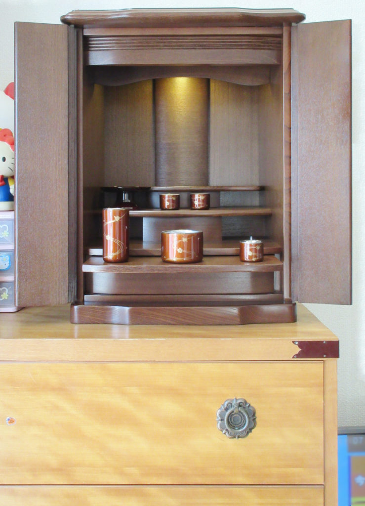 E様はご夫婦で来店されました。置く場所がないとの事で小さなお仏壇を探されていました。色合いサイズお値段とご希望に合った商品をご提案することができ、とても喜んでいただけました。これからもご縁を大切に、長いお付き合いをお願い申し上げます。ありがとうございました。