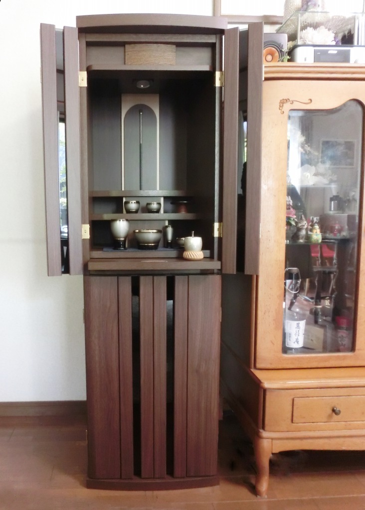 この度はご縁をいただきまして、ありがとうございました。1回目のご来店で家具調仏壇「ミント」をご覧になり「自宅の家具とのバランスを考えてから、また来ます」と帰られました。そして再来店され「ミント」に合う仏具を選ばれ、すんなりご契約いただけました。納品の際「すっきりしてて、この仏壇で良かった」と喜んでくださり嬉しかったです。これからもよろしくお願いします。