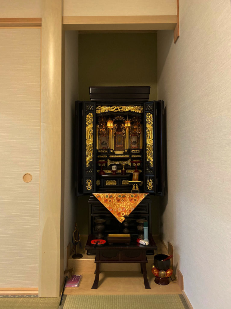 元は紫檀調のお佛壇だったのですが、修復にともない彫刻などに金箔をほどこし金唐木仕様に仕上げさせていただきました。お佛壇の雰囲気が明るくなったと、たいへん喜んでくださいました。これからもどうぞ、よろしくお願いいたします。