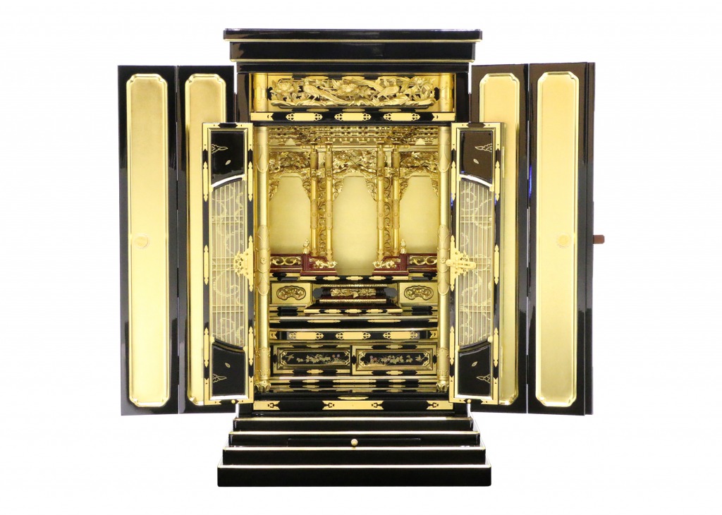 お仏壇の買い替えをしたいとのお電話をいただき、お宅に伺いお仏間のサイズを測らせていただきました。そのサイズにピッタリの金仏壇「光妙」を本社より早速とりよせ準備をし、納品させていただきました。親子で納得して、ご購入いただきました。ご縁をありがとうございます。