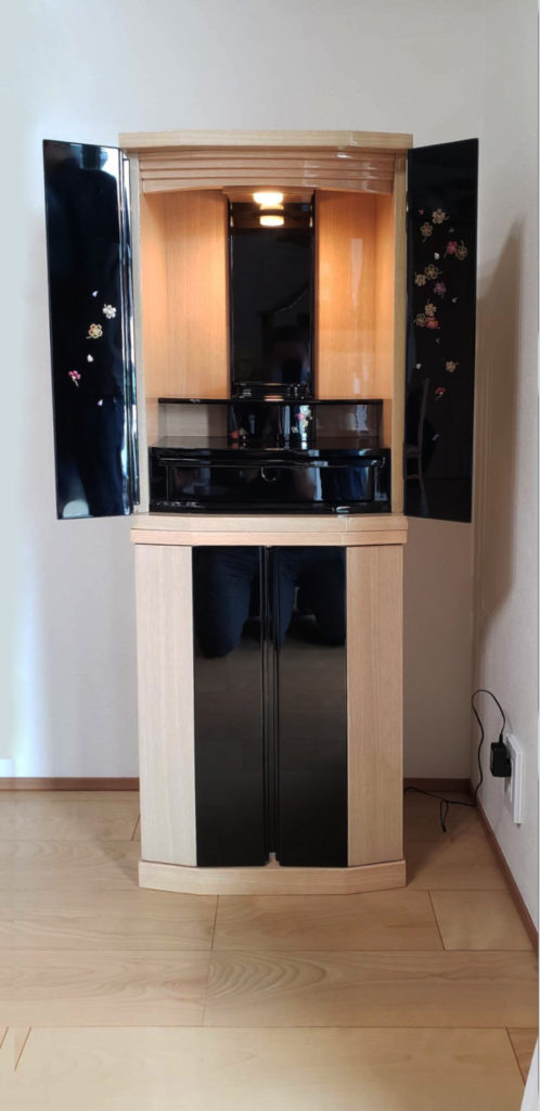 この度はお仏壇の新規購入をしていただきまして、ありがとうございました。新居のリビングに設置させていただきました。熊本震災にて倒壊し、現土地に新築され仏壇購入。以前はお仏壇を書棚扉付に荘厳されており、仏具も日蓮宗のものをお使いでした。本願寺派に変わられるのを機に、今回のお仏壇購入でした。ご満足いただけ安心いたしました。 合掌