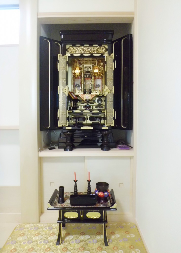 「家の新築に合わせ仏壇を購入したい」とご来店くださいました。いろいろとお話をし、見ていただいて金仏壇「松風」に決められました。新築工事が終わるまでお仏壇を当店でお預かりし、本日無事新しく出来上がったお宅に納品することができました。たいへん喜んでいただけました。お仏壇のお預かりの件に、お礼のお言葉をいただき嬉しかったです。