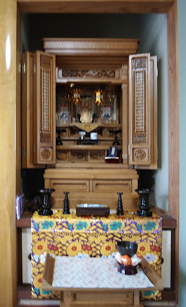 娘さんと1度お見えになり、その後息子さんとも来店してくださいました。色々と迷われていましたので、持ち込みの提案をさせていただきました。やはりお店でお仏壇を見るのと、実際にお仏間にお飾りしてみるのとでは感じが違いましたね。最後は大きさ、色合いからご家族で納得され唐木仏壇「新珠光」を選んでいただけ、安心いたしました。ご縁をありがとうございます。