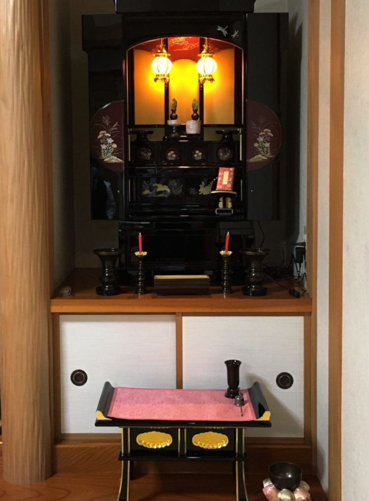 お母様がお亡くなりになられ、御主人様が金仏壇の下見に来られたのが最初のご来店でした。それから数か月後に奥様がお見えになりました。奥様のお好みは金仏壇ではないとの事で、古屋鋪オリジナルの塗モダン仏壇「かぐや」をご提案。次の日ご夫婦そろって再来店され「亡き母が花が好きだったから」とご契約いただきました。ご家族みな様のあたたかい想いと笑顔を、亡きお母様も嬉しく思っていることでしょう。