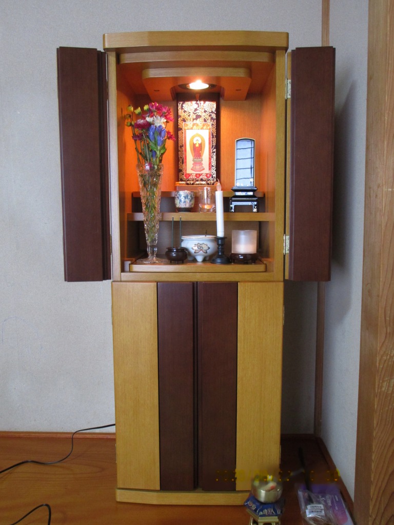 N様には以前より当店をご利用いただいておりました。今回初めてお仏壇の購入を検討されるという事で、何本か見ていただきましたが家具調仏壇「キャスト」のデザイン・サイズを「理想通り」と言っていただき、ご契約となりました。お仏壇を納めて、お仏具を荘厳させていただいた際も、たいへん喜んでくださいました。ご縁をいただき、まことにありがとうございました。