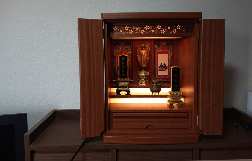 この度は「佛壇の古屋鋪 東開店」にてお仏壇をお買い上げいただき、まことにありがとうございました。ご夫婦で来店されました。いろいろ迷っていらっしゃいましたが家具調仏壇「リオン」に決められました。間接照明が美しいお仏壇です。このご縁を大切にしていきたいと思います。