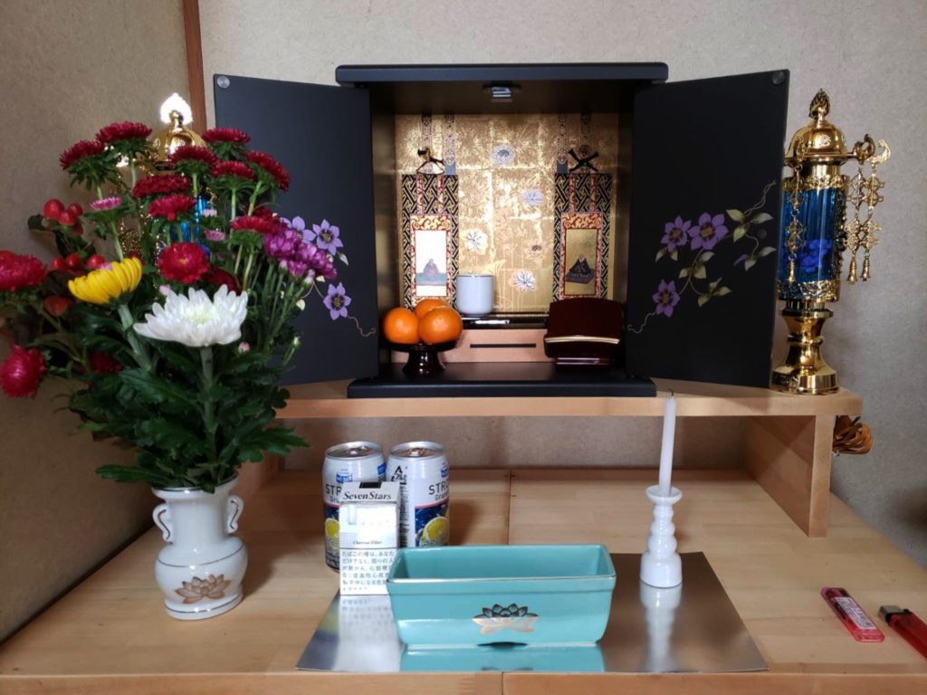 奥様が「亡き主人のために」とご購入されました。息子さんと後々のことも含め、いろいろと話し合われて「ミニ仏壇が良い」と塗モダン仏壇「鉄仙」をご契約くださいました。ご縁をいただき感謝しております。今後とも、よろしくお願いいたします。