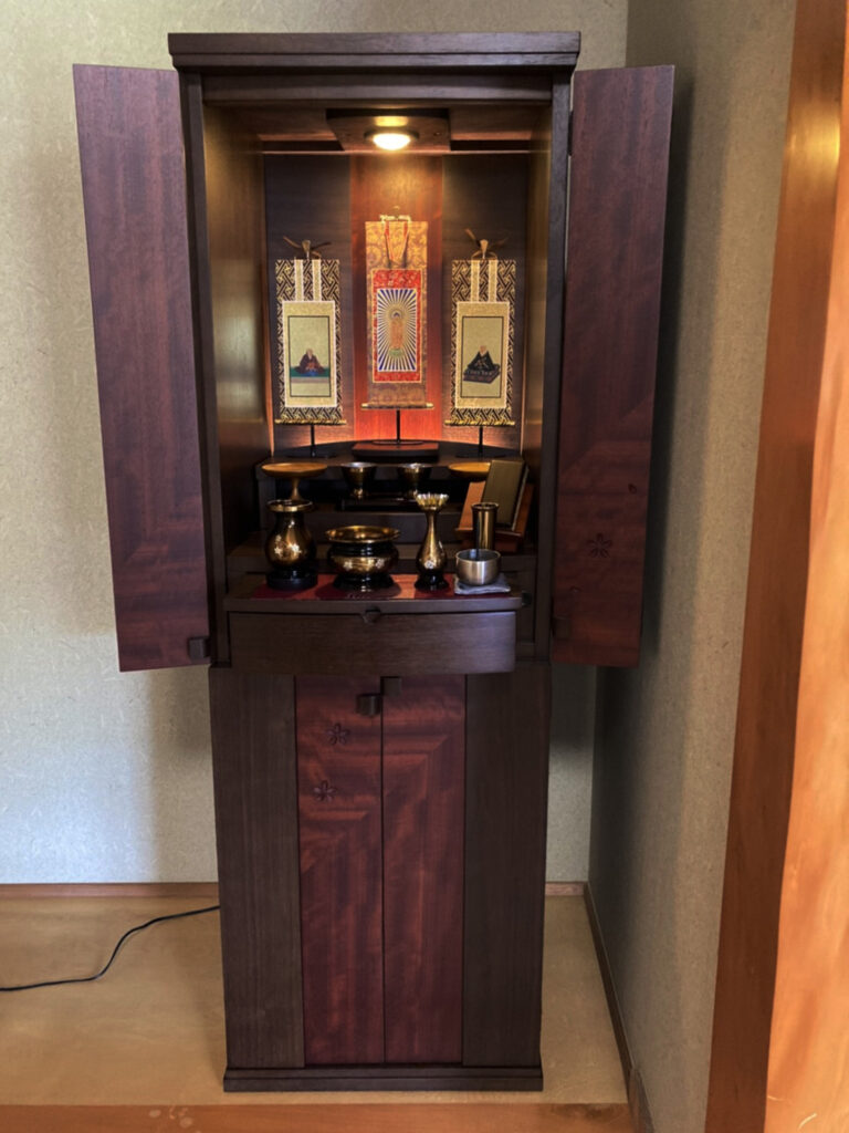 Y様は「そろそろ仏壇を準備したい」と言って、ご来店されました。シンプルなお仏壇をお探しでした。床の間に置かれるとの事で家具調仏壇「スラッシュ」を選ばれました。木目が優しく、仏具を置いたままでも収納でき、ライトを点けると幻想的な表情に変化するお仏壇です。きっとお子様たちもご先祖様に手を合わせてお話をされる、にぎやかな場所になることでしょう。またお店の方へお越しになられるのを、楽しみにお待ちしております。