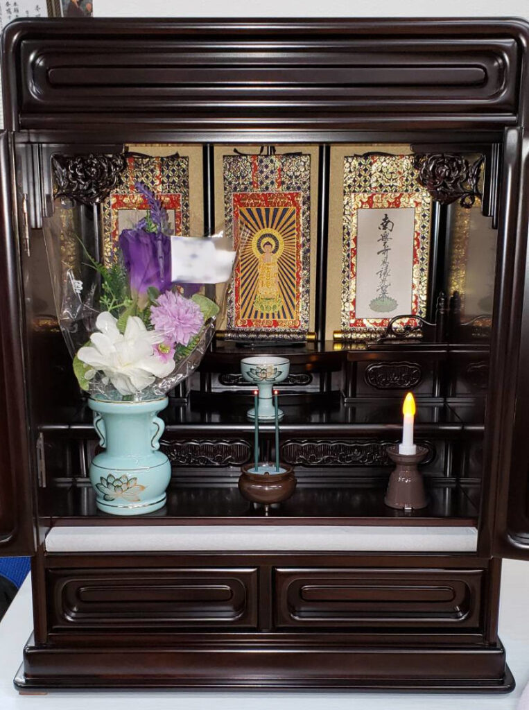 この度はお仏壇のご購入、まことにありがとうございました。コンパクトな「箱壇丸須弥」を気に入ってくださいました。ご高齢のお母さまが火を扱われるのが心配とお伺いしましたので、電子線香、ローソクをご提案させていただきますと、安心されていました。これからも、このご縁を大切にいたします。末永くお付き合いいただけますよう、よろしくお願いいたします。 合掌