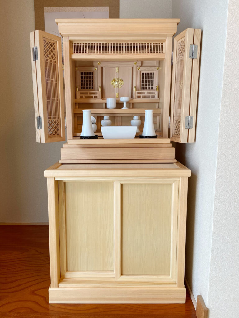 N様は娘さんと来店され、亡くなられた奥さまのための神道壇を、お探しでした。「しっかりとした神道壇を家の中に置きたい」とのこと。ちょうど良い大きさの下台も見つかり、床の間に立派な神道壇を納めることができました。これからも神道壇を通して、奥さまと毎日会話されることと思います。ありがとうございました。