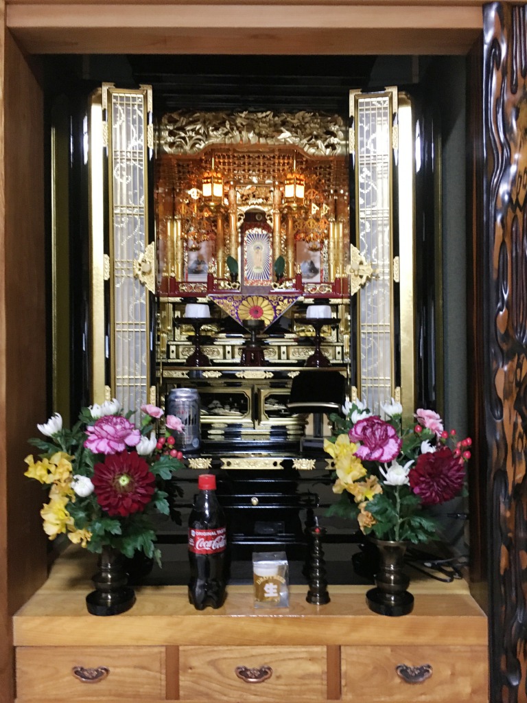 ご子息を亡くされ、お仏壇を見に来店されました。小型を見ておられましたが、門徒様で仏間もあるとの事でしたので、浄土真宗と金仏壇についてお話をさせていただきました。ご夫婦ともにご理解いただき仏間サイズに合う「月光京台」をご契約くださいました。納品させていただきますと仏間にぴったりで、たいへん喜んでくださいました。