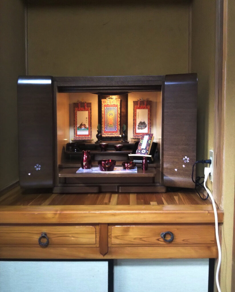 O様は「あかるくて可愛いお仏壇を」と決められてのご来店でした。お選びいただいた「リバティ」は扉に【螺鈿】という貝殻の光沢部分を散りばめた技法を使用して作られた美しさと高級感のあるお仏壇です。「とても可愛くて綺麗だ」と、たいへん気に入ってくださり無事納品までさせていただく事ができました。これからも「佛壇の古屋鋪 出水店」を、よろしくお願いいたします。