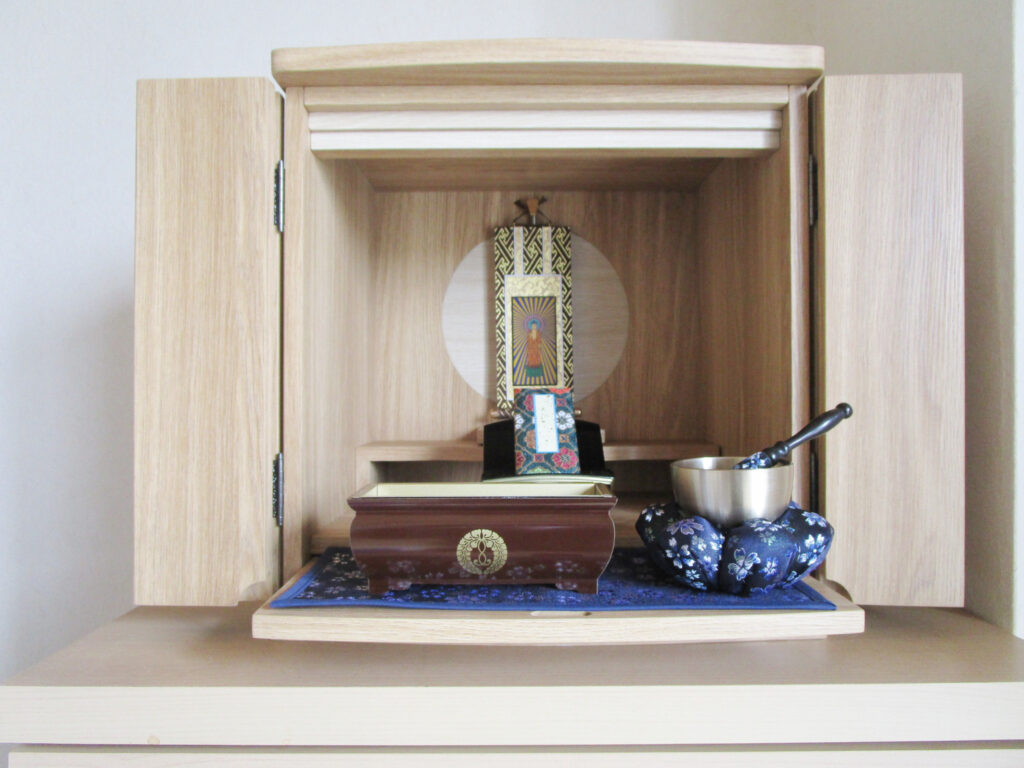 「小さいお仏壇が欲しいんです」と娘さん親子とご一緒に来店されました。将来のことも考え、また置けるスペースも限られているとのことでしたので小型の「月しずく」をご提案いたしました。娘さんより「火事も心配で」とのお話がありましたので「短いローソク、お線香もありますよ」とお伝えすると「これだったら安心です」とご購入くださいました。「手を合わせられる場所ができたので安心です」と言って帰られたので私たちも嬉しく思います。