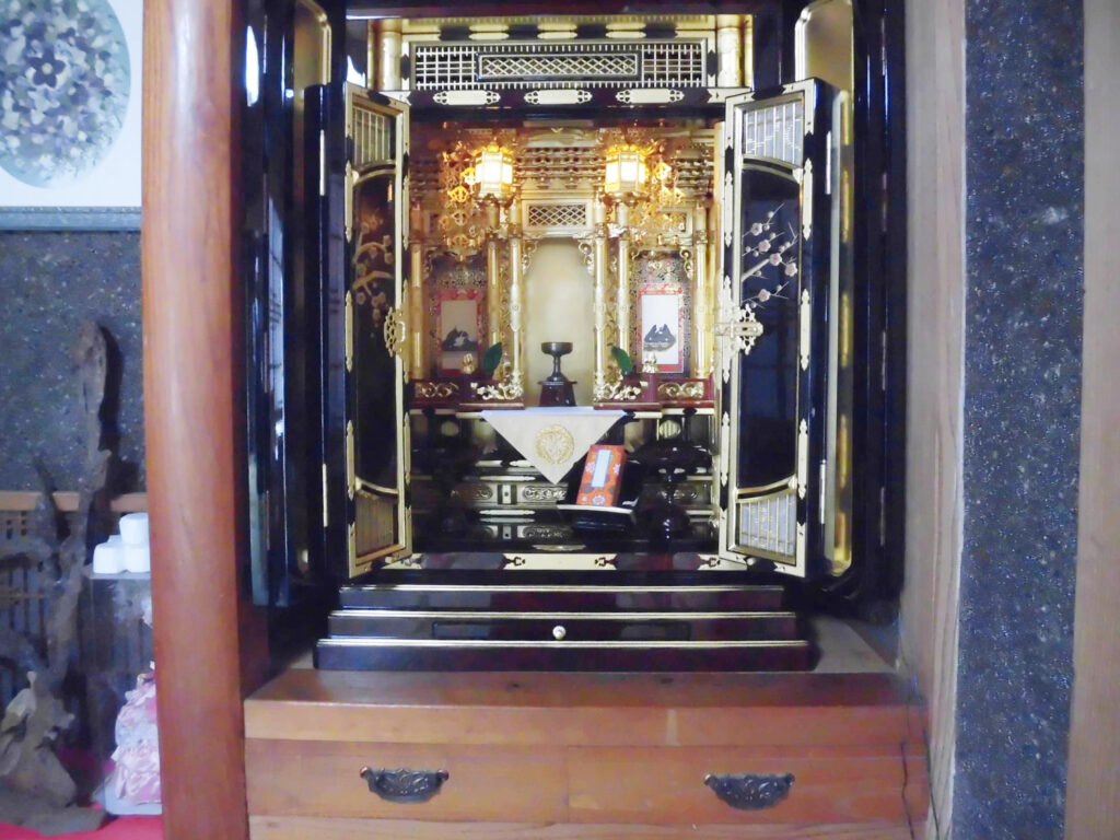 この度はご来店、お仏壇のご購入ありがとうございました。ご主人を亡くされたH様。杢出仕様の金仏壇を気に入ってくださいました。お仏間にも最適な形で納めることができ、たいへんよろこんでいただけました。今後とも、よろしくお願いいたします。