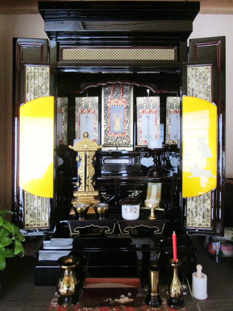 奥さまのご実家のお仏壇の買い替えのご検討で来店くださいました。はじめは唐木仏壇をみておいででしたが奥様が古屋鋪オリジナルの金仏壇「兎月」を気に入ってくださり、ご契約となりました。川辺工場で作られた当社自慢のお仏壇を選んでいただき、とても嬉しく思います。