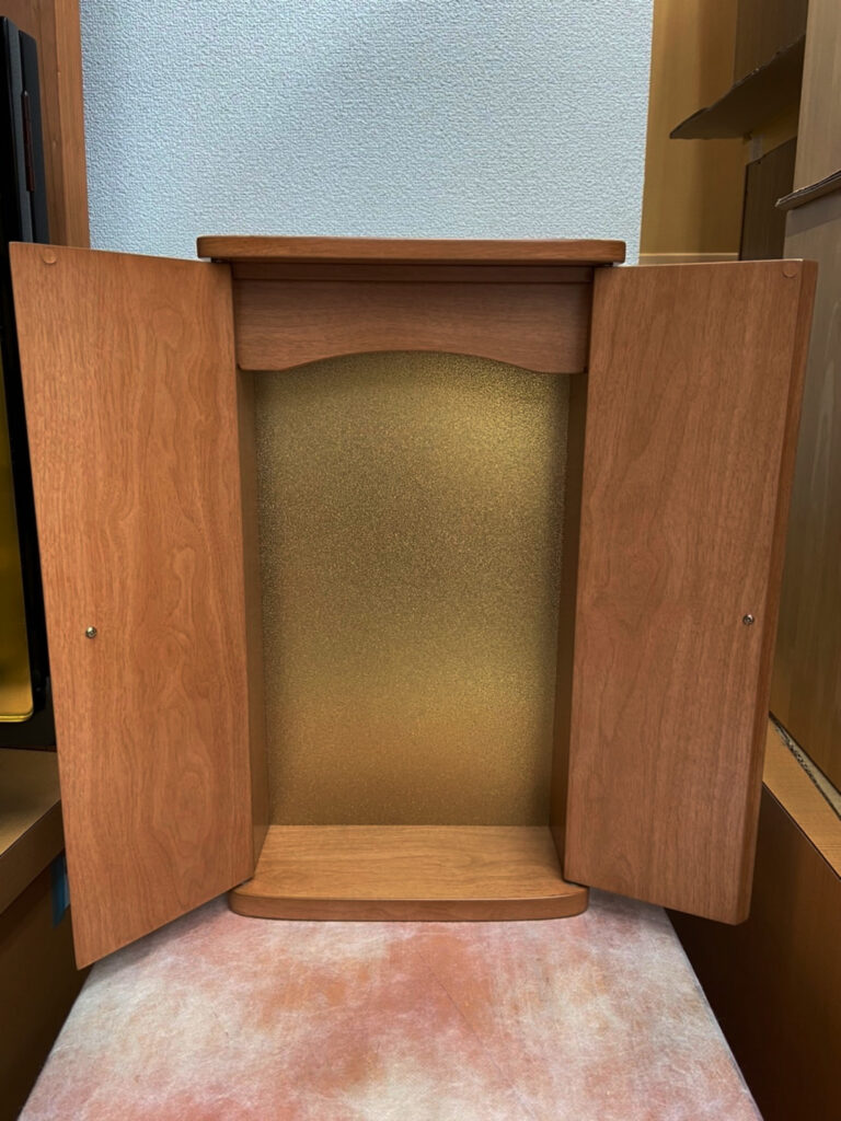 仏具を購入しに来られたH様。その際、ご本尊の意味をご説明すると、納得していただけお迎えされるために家具調仏壇をご購入くださいました。嬉しく思います。このご縁を大切にしたいと思います。これからも分らない事がございましたら、ご連絡ください。お待ちしております。