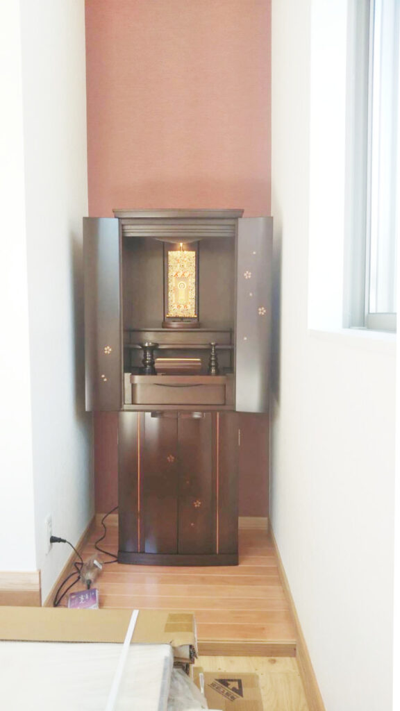 この度はご新築おめでとうございます。息子さんとお母様で来店されました。「家の仏間の色に合うね」と二人で話され家具調仏壇を選ばれました。このご縁に感謝します。末永く、よろしくお願いいたします。