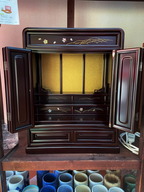 ご夫婦で来店されました。お二人とも唐木仏壇を気に入ってくださいました。桜の花びらがとても素敵なお仏壇です。ご先祖様もお喜びのことと思います。ご縁をいただき、ありがとうございました。