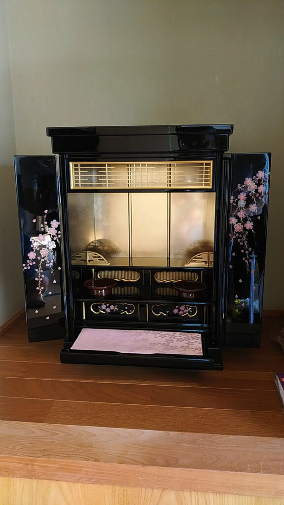 ご実家にはお仏壇をお持ちでしたが「自分たちも手を合わせる場所が欲しい」と考えられてのご来店でした。「ゆくゆくは実家の仏壇も見ていかないといけないかも」と、小型の塗モダン仏壇を選ばれました。「これでいつでも手を合わせられる」と喜んでいただき、私どもも嬉しく思いました。この度はありがとうございました。
