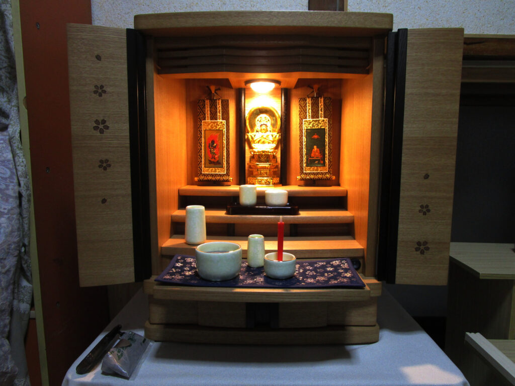 お母様を亡くされ、新しいお仏壇の購入をご検討で来店されました。ご家族で色々ご検討いただき、家具調仏壇を選んでくださいました。お母さまは緑がお好きだったとのことで、淡い緑色のお仏具を提案させていただきました。喜んでいただけ良かったです。今後とも長いお付き合いを、よろしくお願いいたします。この度はご縁をいただき、まことにありがとうございました。