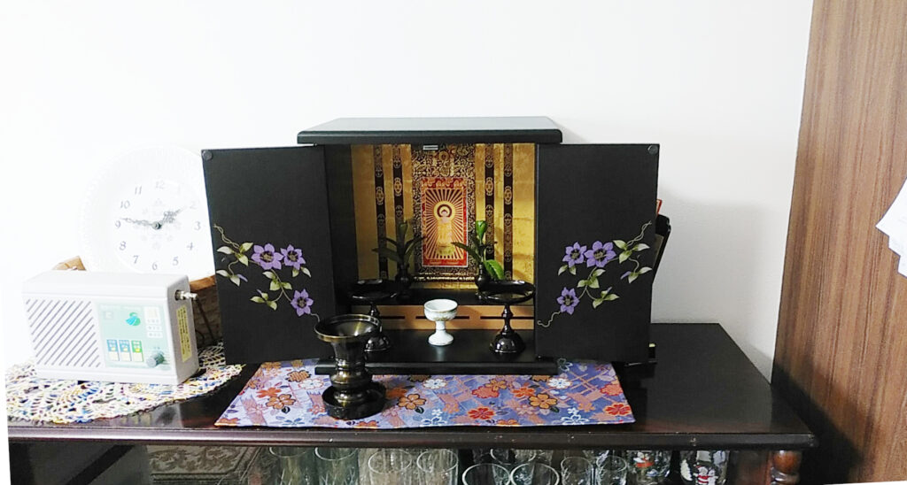 「アパートに引っ越して1年がたち、御経机と過去帳だけを置いているだけでは申し訳ない」と、今回お仏壇をお迎えされました。ご夫婦での御来店でした。置くスペースが限られている中、黒色で背板には金、扉には花の描かれた、金仏壇に近いデザインの塗モダン仏壇を選ばれました。たいへん喜んでいただけました。ありがとうございました。