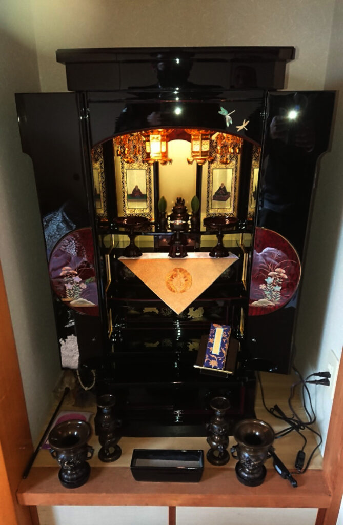 ご主人様を亡くされ、お寂しい中ご来店くださいました。現代風のお仏壇が良いとのことで「かぐや」をご購入くださいました。今後とも長いお付き合いを、よろしくお願いいたします。