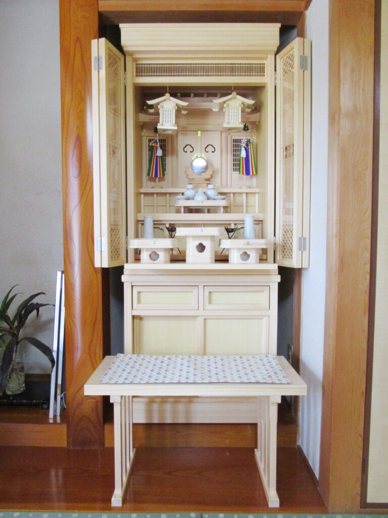 知人から紹介を受け訪問させて頂き、その後来店くださいました。神間にピッタリの神道壇「ひもろぎ」をご家族全員が気に入ってくださいました。お父様が生前に購入されていたお仏壇がありましたが、今回の神道壇はみな様がお父様を思われ選ばれたものですので、お気持ちが伝わりきっと喜ばれている事でしょう。この度はご縁をいただき、まことにありがとうございました。