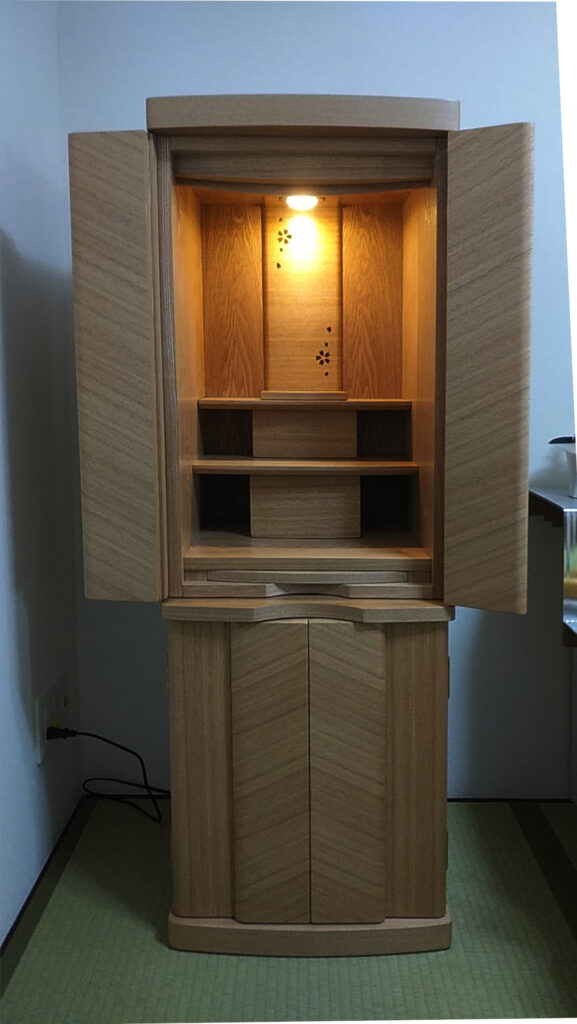 マンションにお住いのお母さまのために家具調仏壇をご用意されました。和室に合わせ優しい色合いのお仏壇を選ばれました。喜んでいただけ、嬉しく思います。何かありましたら、お気軽にご連絡ください。この度はご縁をいただき、ありがとうございました。