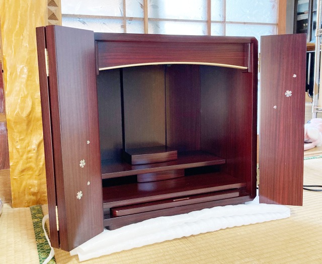 この度は遠方よりバスでお越しくださいまして、まことにありがとうございました。とても良いお仏壇をお持ちですが、引越されるにあたり家具調仏壇に買い替えられました。今回ご本尊も新たに本山よりお迎えされました。とても良い事だと思います。ぜひ長く大切にお使いくださいませ。