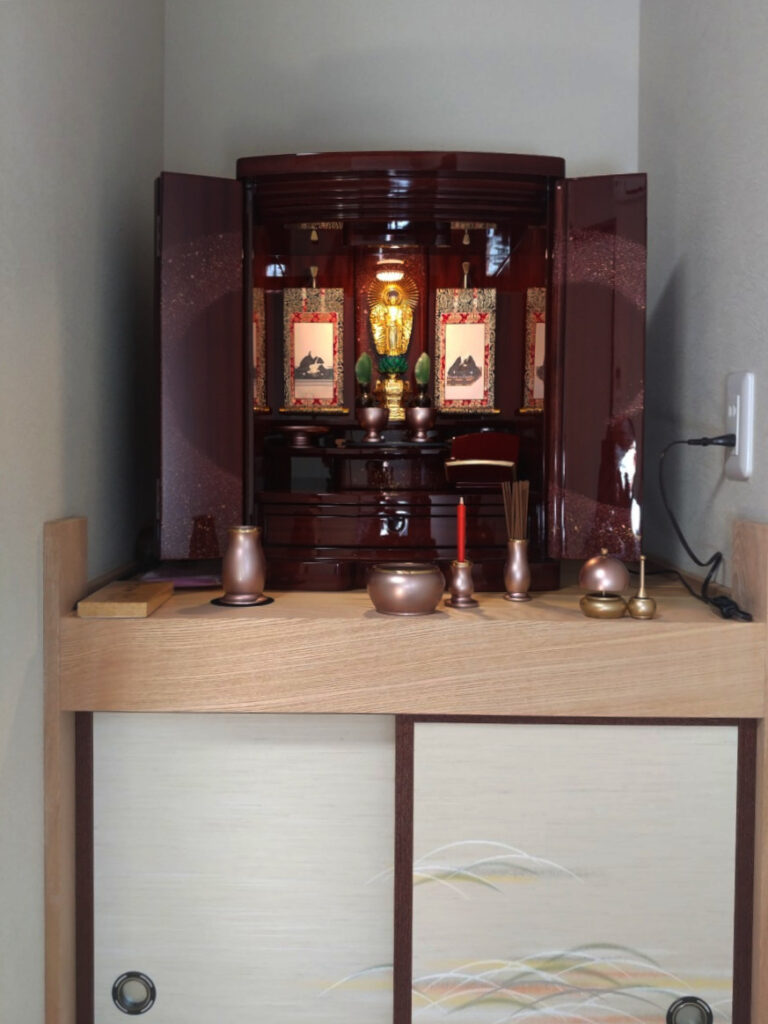 「お待たせしました!やっと住まいが完成しました」と弾むような元気な声で奥さまよりご連絡をいただきました。ご契約から1年。ようやく納品させていただくことができました。「これから毎日手を合わせることが楽しみだ」とたいへんお喜びくださいました。こちらも安堵いたしました。今後とも末永いお付き合いを、よろしくお願いいたします。