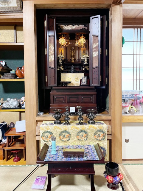 ご家族で過去帳を買いに来店されました。2度目のご来店の際「お仏壇を買い替えたい」とご相談くださいました。娘さんが唐木仏壇を一目で気に入ってくださいました。仏間改造をしてしっかりと納まりました。和風のお宅に色合いなどがピッタリで、とても素敵な雰囲気になりましたね。末永くご家族を見守ってくれることと思います。ご縁をいただき、ありがとうございました。