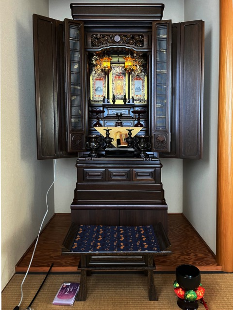 「実家には仏壇があるが新しく買い替えたい」と来店されました。床の間に置かれるとのことでしたので仏壇台とセットでご提案させていただきました。大きさもちょうど良く、しっかりと納まりお家が引き締まりましたね。ご縁をいただき、ありがとうございました。