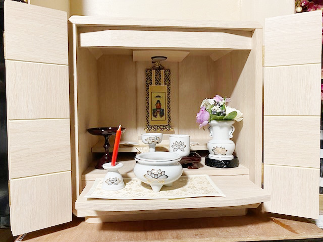 まず息子さんご夫婦が来店されました。「母のために小さな仏壇を」と仰っていました。後日、ご家族皆様で来てくださいました。とても仲の良いご家族でした。全員一致ですぐに家具調仏壇に決めていただけました。息子様手作りの仏間にピッタリと納まりましたね。亡きお父様が安心して喜んでいらっしゃるお姿が目に浮かびます。この度はご縁をいただき、ありがとうございました。