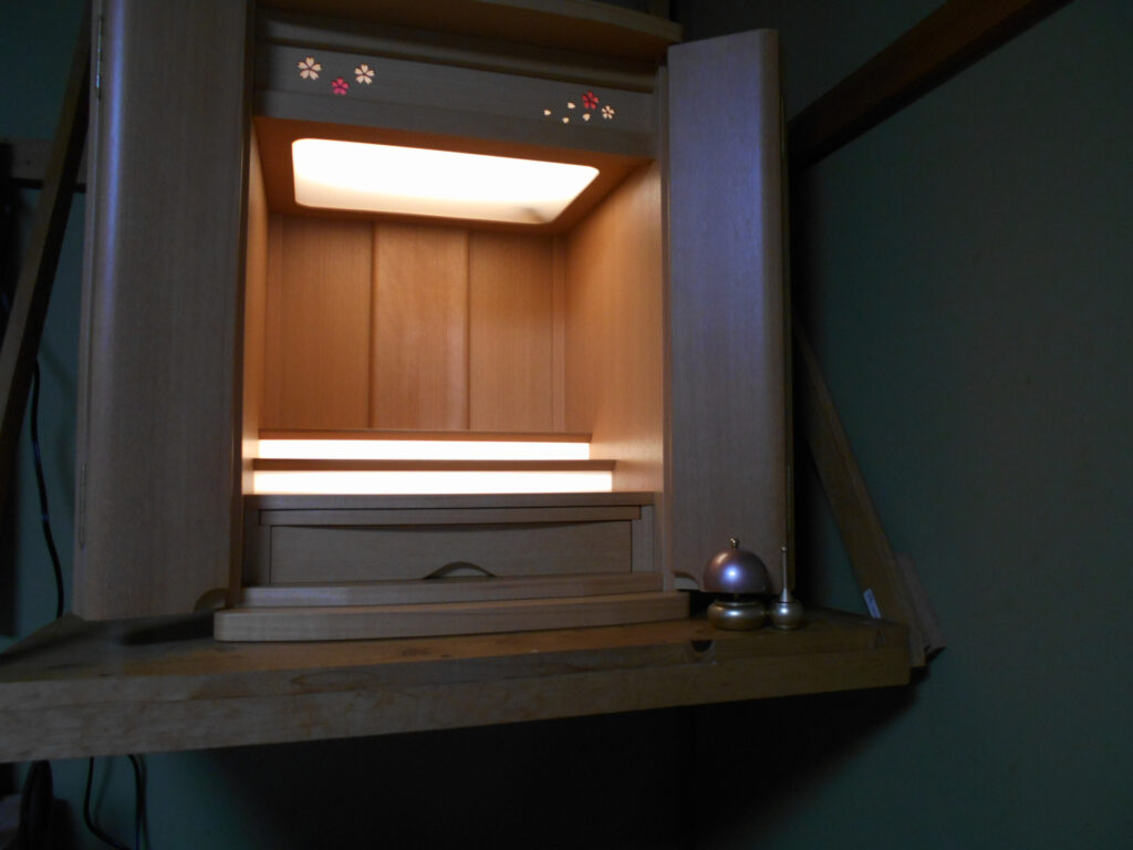 U様はまずお位牌を作ってくださいました。それからお仏壇のお話になりました。明るいお仏壇を選ばれました。本日お届けいたしました。棚に納めましたが、まるでお仏壇に合わせてあつらえたかのようにピッタリと納まりビックリいたしました。ご主人が以前、手作りされた棚だそうです。ありがとうございました。今後ともよろしくお願いいたします。