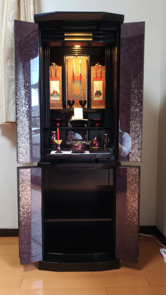 以前よりご縁をいただいていたM様。ご主人を亡くされお仏壇のご相談を受けました。奥さまと娘さんがカタログで家具調仏壇を気に入ってくださいました。ご主人とゆっくりお話しする場所ができ、奥さまも安心されたご様子でした。分からないことなどありましたら、いつでもご連絡ください。今後ともよろしくお願いいたします。