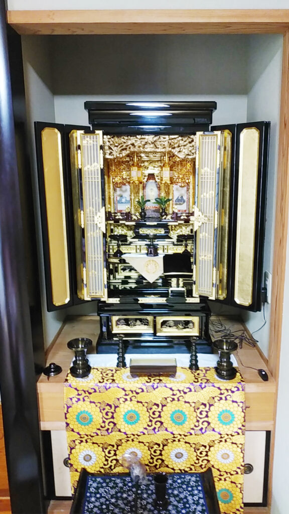 お母様を亡くされたI様。「実家のお仏壇を処分して、ご自宅に新しいものを迎えたい」と来店されました。仏間を準備され、真宗専用の金仏壇をお求めになりました。「今まで仏壇のことは母がしていたので、何も分からない」と心配されていました。お店のご近所なので、いつでも気軽にご相談くださいませ。この度はありがとうございました。