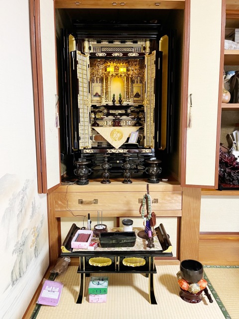 最初はお仏壇修復のご予定でしたが、いったんキャンセルされました。数カ月後に「買い替えたい」とのご相談で、お電話をくださいました。仏間にピッタリの金仏壇を選んでいただくことができました。家がたいへん引き締まったことと思います。数ある仏壇店の中から当店を選んでいただき、誠にありがとうございます。ご満足いただけ嬉しく思います。このご縁に感謝いたします。