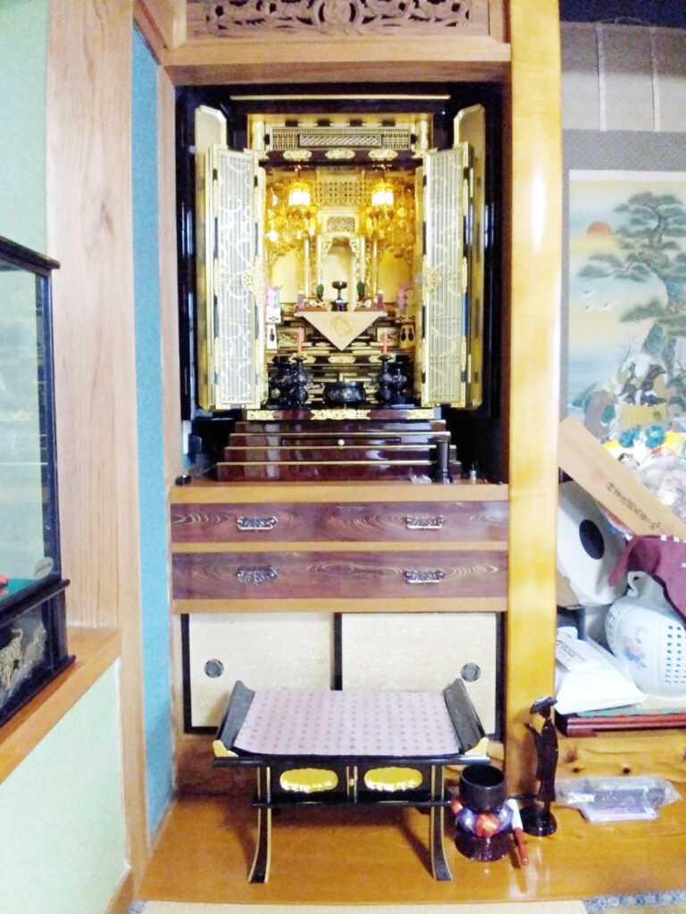 「家を建ててから今まで物置になっていた仏間に仏壇を入れたい」とのご相談でご家族で来店されました。杢出塗りの技法が美しい明るい金仏壇に決めてくださいました。筬欄間は彫刻が少なく見た目もスッキリしていますし、面取り部分に金で装飾を施した贅沢な造りになっています。「仏壇が入った仏間は引き締まった感じがする」と喜んでいただけました。