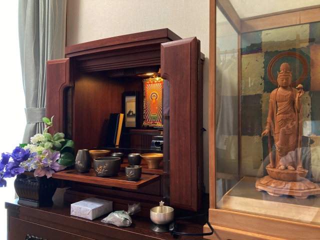 お仏壇の買い替え、誠にありがとうございました。たいへん大きなお仏壇をお持ちでしたがマンションに引っ越されるため買い替えられました。ご本尊は今までのものを表装直しをして新しいお仏壇に安置することが可能となりました。今までとかわらない「お仏壇のある暮らし」をされてください。