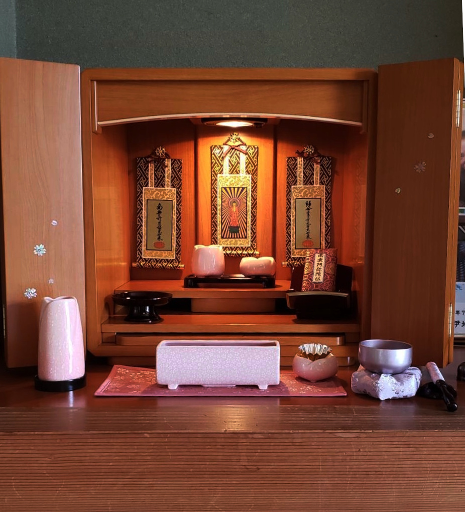「実家の仏壇がたいへん大きく自宅に置く場所がない」と小型のお仏壇を探して来店されました。お仏具を優しい色とデザインのもので揃えられたので、ちいさくてもとても温かみのあるお仏壇になりました。たいへん喜んでいただけました。これからもどうぞ、よろしくお願いいたします。